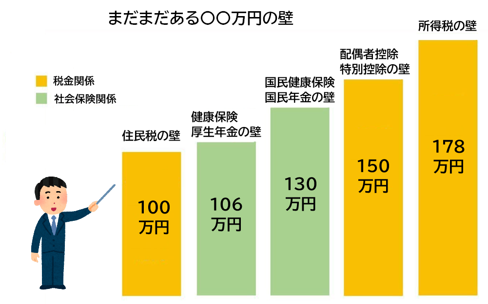 一般に「年収の壁」と呼ばれるものには、次のような種類があります。